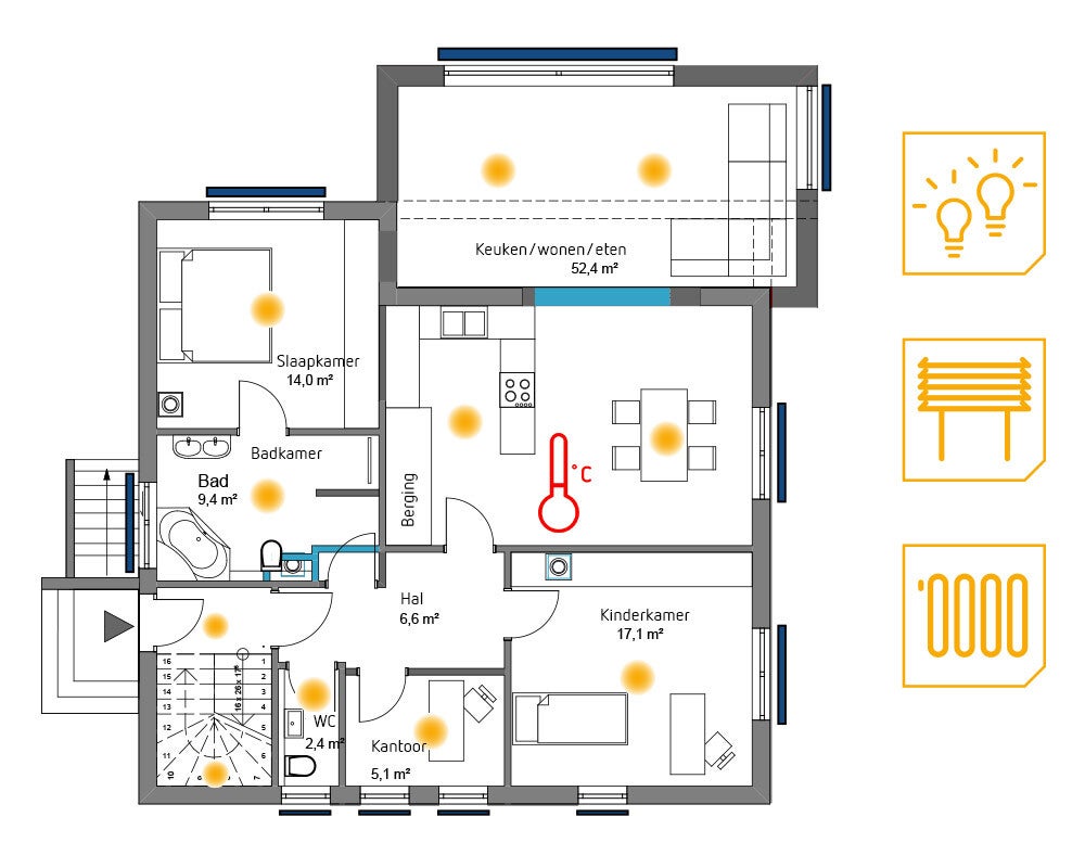 Om de mogelijkheden beter in te schatten, vindt u hieronder telkens als voorbeeld een kosten overzicht voor de toepassingen: verlichting / verlichting + rolluiken / verlichting + rolluiken + verwarming van een conventionele elektrotechnische installatie met het LUXORliving systeem van de firma Theben. Het systeem is gebaseerd op het KNX en KNX-RF (draadloos) techniek. De aangegeven prijzen zijn voorbeeld berekeningen van diverse installatie kenmerken.